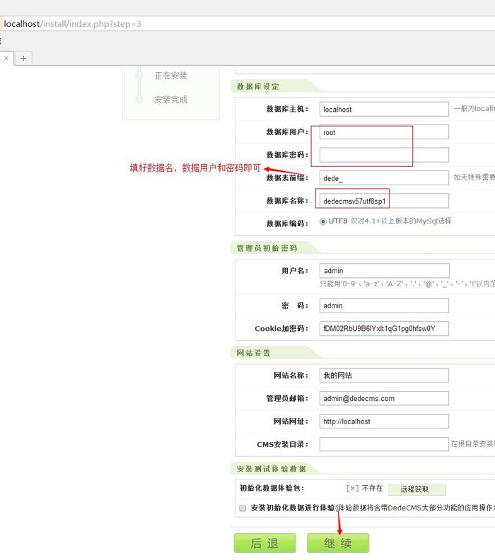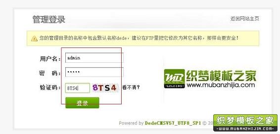 织梦安装教程步骤五:一般没另外设置用户和密码的都是admin 默认织梦模板用户和密码。