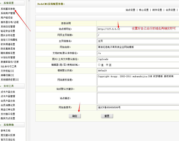 织梦安装教程步骤九:后台,点击"系统"-"系统基本参数",修改网站地址,填好你的域名,保存。